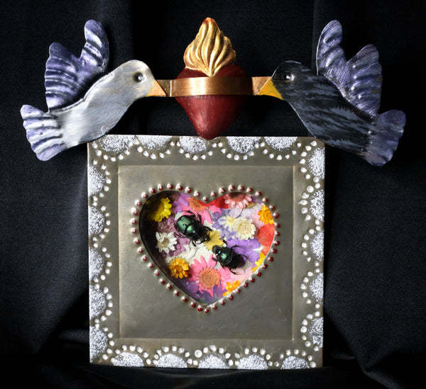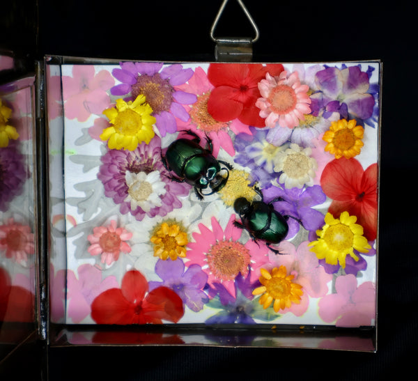 Bring a touch of the extraordinary into your home with this Green Horned Beetles Nicho. Handcrafted nicho sourced from Mexico and exquisitely painted in Michigan by Beth Watson, this stunning piece showcases a male and female pair of Onthophagus mouhoti dung beetles nestled against a field of real dried flowers. Its unique design, measuring about 7”x6.5”, makes it a captivating focal point that inspires admiration and conversation!